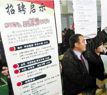 杭州一家信息科技公司打出“月薪万元不是梦”的广告语,来吸引学生的注意。“我们是一家网络公司,主要看网络销售业绩,做得好,单提成一个月拿6万元的都有。”