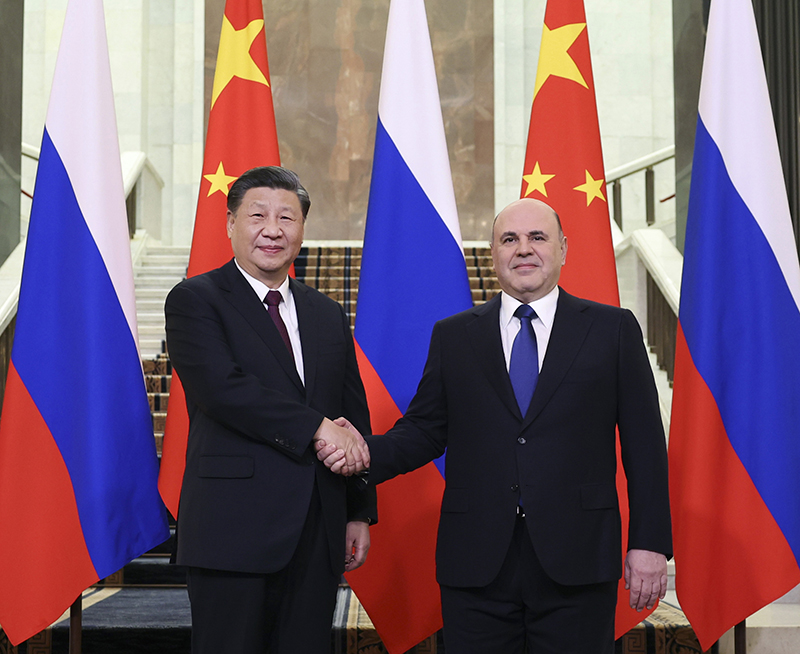 习近平指出,中俄是相互最大邻国,又是全面战略协作伙伴,保持中俄关系健康稳定发展,符合两国关系的历史逻辑和两国人民的根本利益。中国成功召开了中共二十大,前不久全国两会选举产生了新一届国家机构领导人,中国党、国家和人民空前团结,正在全面推进中国式现代化。中国新一届政府重视发展中俄全面战略协作伙伴关系,愿同俄方通过两国政府总理定期会晤等机制化交往渠道,推动实现两国合作新目标,取得更多新成果。